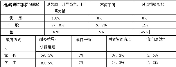 [NextPage]从上面两个表中可以看出,虽然接受第一种家庭教育方式的学生不一定能做得优秀,但做得优秀的学生必然离不开这样的教育方式。由此,我们不得不承认,要提高学生的学习成绩,规范学生的行为举止,采取以说教为主,以强硬手段为辅的教育方式是十分重要的。
