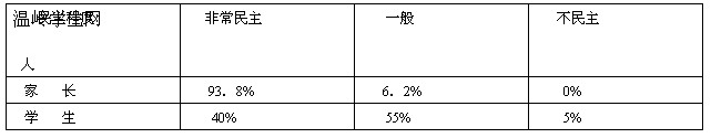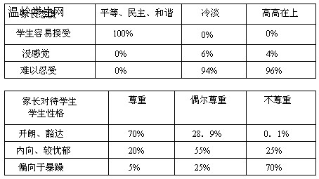 通过上表,我们不难发现:学生很容易接受家长平等、民主、和谐的态度,这可以使学生感到家庭的温馨和亲切主动地和父母交流,从而让父母了解自己的想法和情况,对自己进行更多针对自己问题的、有实效的教育;个人权利尤其是隐私权,能受到父母尊重的学生,往往性格开朗。这不仅能使学生主动和家长沟通,与家长关系融洽,而且对学生自身的健康,以及将来在社会中立足也是不无裨益的。