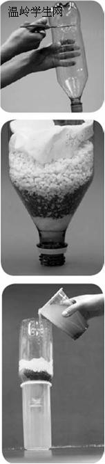 2.向倒置的瓶子中放入粗砂砾(注意尽量不要使棉花团移动),然后再向瓶中铺细沙,接着将纸巾铺在细沙的上面, 这样一个过滤水的装置就做好了,我们把它叫做过滤器。现在可以过滤了,把过滤器瓶口朝下放在一个大塑料杯子上。