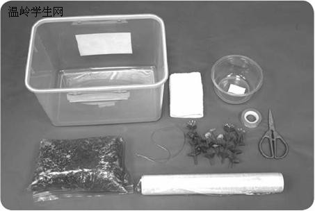 土壤(两公斤左右);水(500ml);塑料碗一个(口径大约15cm);大塑料容器;塑料膜;橡皮筋或橡皮圈一根;剪刀;清洁布;胶带;小饰物若干;可选材料:塑料杯(装水用)、一袋冰、可通过照明使物体加温的白炽灯。